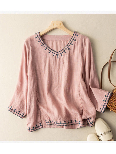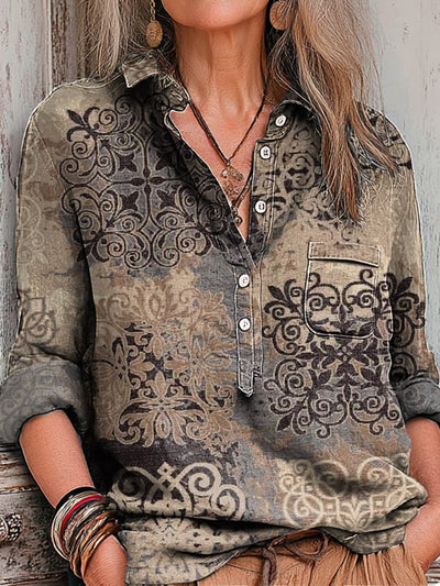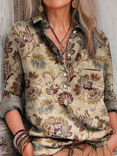 Camisa casual de algodón y lino con impresión artística floral étnica vintage para mujeres